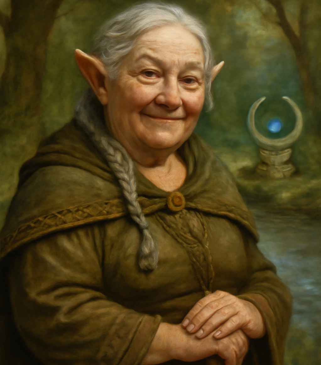 Elara Meadowlight is the respected Village Elder of Riverbend and the devoted guardia...